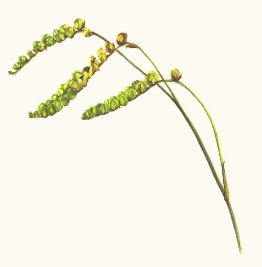 Aquarel (2004) Het zaad van de Crocosmia is prachtig. Het stadium waarin ik het schilderde was net het moment dat de zaden van frisgroen verkleurden naar oker. Ook spleten de eerste zaden open terwijl ik het schilderde. Volgend jaar zijn de bloemen aan de beurt. |