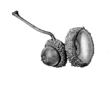 In het najaar ben ik naar het bos Overholland geweest. Daar vond ik dit eikeltje en stonden deze bovisten (Scleroderma areolatum). De tekeningen zijn ietsje vergroot.