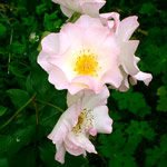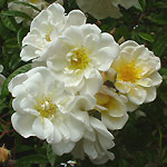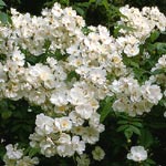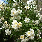 LYKKEFUND: Kleinbloemige leiroos (1930). Trossen roomwitte halfdubbele, geurende bloemen. Bloeit eenmaal maar wel zeer uitbundig. De roos heeft maar heel weinig doorns. In de herfst veel kleine oranje botteltjes. Al met al wordt deze roos zo'n meter of 6 hoog. |