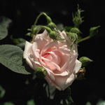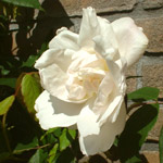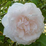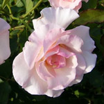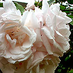 Mme. ALFRED CARRIERE: Noisetteroos (1879). Over ijzersterke klimrozen gesproken. Nog zo een. Grote, komvormige, los gevulde bloemen. Roomwit met wat rozige blos. Zoetgeurend en doorbloeiend. Krachtige groeier die een meter of 5 hoog kan worden. De eerste roos die gaat bloeien in onze tuin. |