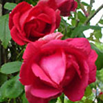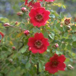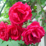 PAUL'S SCARLET CLIMBER: Klimroos (1915). Nog zo'n ijzersterke roos. Bij ons staat hij in de schaduw op een droge plek maar doet het daar prima. Halfdubbele scharlakenrode zacht geurende rozen die door blijven bloeien tot diep in de herfst. Bloeit in trossen. Hoogte ongeveer 6 meter. |