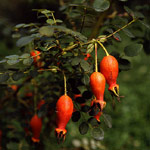 ROSA MOYESII 'GERANIUM': Botanische roos (1938). Hoge struik (2 meter) met enkele bloemen die helderrood bloeien met gele meeldraden. In de herfst veel grote oranjerode flesvormige bottels aan overhangende takken. Blad is fijn en aan de onderkant voorzien van kleine rode stekeltjes. |