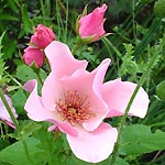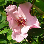 DAINTY BESS: Een Hybride-Theeroos (1925). Hoogte is ongeveer 80 cm. Bijna enkelbloemige roos met een mooie zachtroze kleur aan de binnenkant en een donkerder roze kleur aan de buitenkant. Geurt goed. Meeldraden zijn eerst oranje-geel verkleuren via rood naar zwart. |