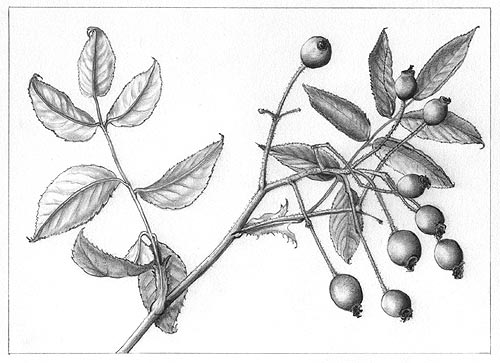 Potloodtekening (2004) Als voorbereiding op de pentekening heb ik eerst deze potloodtekening gemaakt. Uiteindelijk ben ik over deze tekening het meest tevreden. Het leuke van deze tekening is ook dat de open, luchtige groei van de roos te zien is. Het blaadje links heeft zichzelf helemaal omgekeerd waardoor je de onderkant van het blad ook kunt zien. |